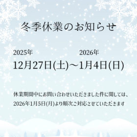 冬季休業のお知らせ 拝啓 時下ますますご清祥のこととお慶び申し上げます。 平素は格別のお引き立てを賜り厚く御礼申し上げます。 誠に勝手ながら、以下の期…
